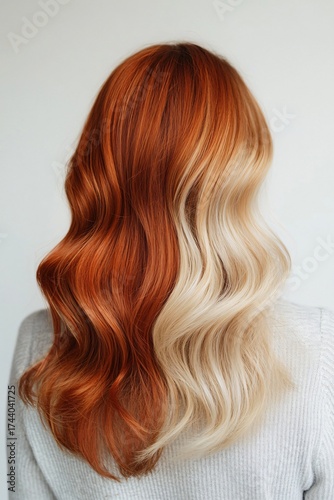 Woman's wavy two toned hair half ginger red and half blonde against a plain background