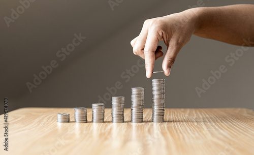 Women are stacking coins on top of the coin pile on the highest row. Placing coins in a row from low to high is comparable to saving money to grow more. Money saving ideas for investing in funds.