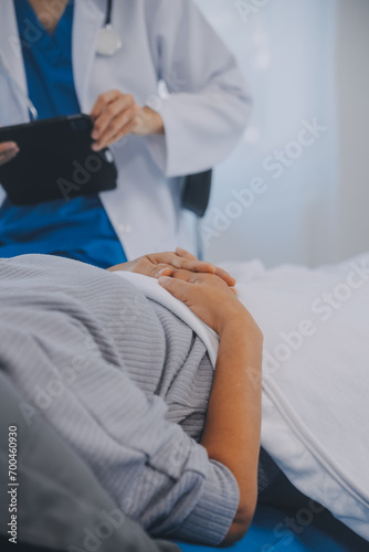 Women Asian doctors hold the patient hand and encourage and provide medical advice While checking the patient health in bed. Concept of Care and compassion, antenatal care, Threatened abortion