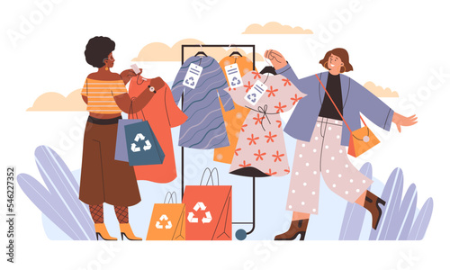 Women buying sustainable clothes with recycled symbol, flat vector illustration isolated on white background.