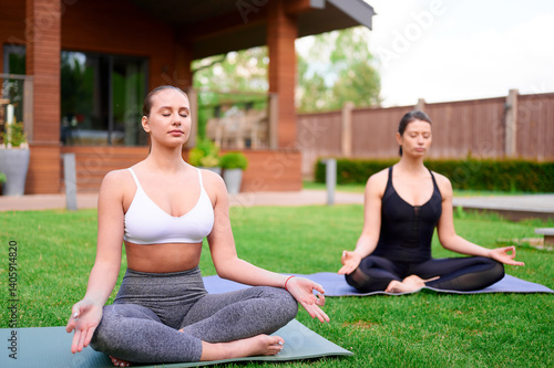 women practicing yoga outdoors focus on meditation and mindfulness. both women in athletic wear seated cross-legged on mats in grassy backyard with modern house view, serene exercise setting