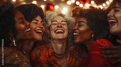 woman, laughter, joy, celebration, friendship, party, group, happy, diverse, warm, festive, lighting, togetherness, fun, smile, friends, happiness, community, social, gathering, event, positive, energy, good, time, people, portrait, closeup, expression, emotion, candid, real, moment, evening, night, indoor, gold, jewellery, clothing, style