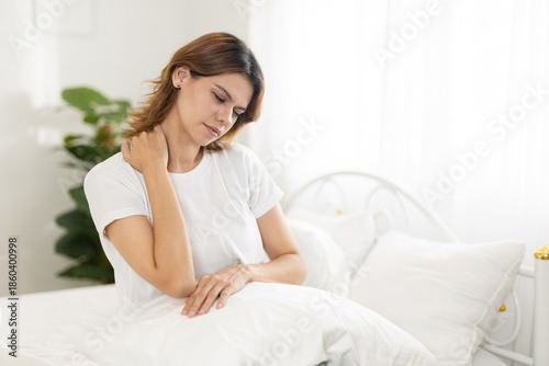 women sitting in bed holding her neck in pain, suffering from muscle strain or bad posture. Perfect for health, body pain, ergonomic issues, stress or wellness related concepts.