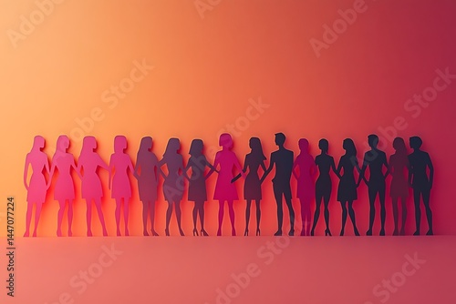 paper, people, figure, colourful, celebration, oneness, togetherness, teamwork, community, support, group, diversity, inclusion, success, achievement, silhouette, vibrant, bright, cheerful, optimistic, positive, uplifting, hopeful, playful, fun, creative, artistic, design, cut-out, standing, holding hands, linked, connection, bond, solidarity, collaboration, cooperation, harmony, strength, empowerment, equality, sisterhood, brotherhood, friendship, orange background, gradient, female, male, pink