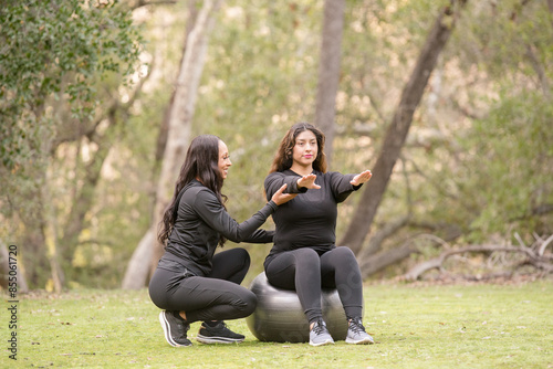 ethiopian, active, adult, african, african american, athlete, athletic, ball, black, exercise, female, fit, fitness, girl, health, healthy, hispanic, lifestyle, nature, outside, people, person, sport, squat, summer, together, training, tree, woman, physical exercise, yoga, young, california, us, 30s, two people, multiracial