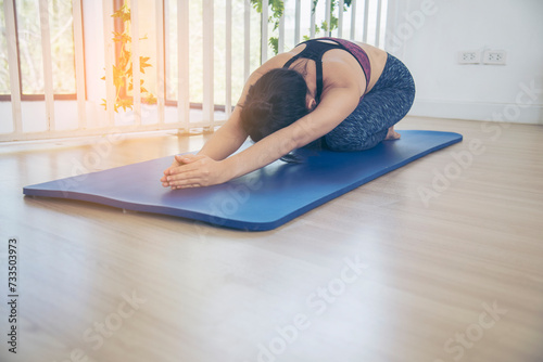Women yoga meditation stretching back, arm meditate home fitness on floor. Happiness Young women doing yoga Balasana child pose. Wellness woman in sportswear meditate relaxation stretch health care