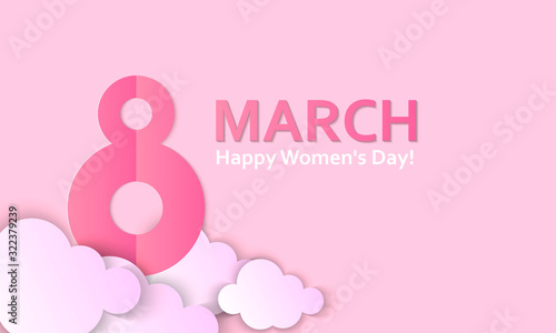 Womens day horizontal postcard or banner with eight sign and paper cut clouds on a pink background.