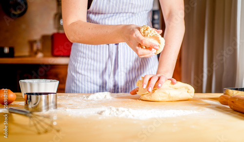 women's hands knead the dough on the table, kitchen accessories