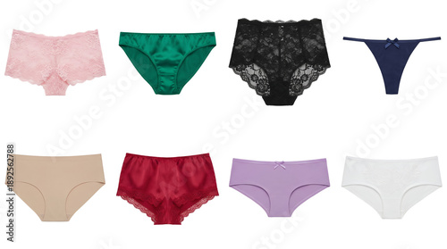 Women's underwear set including lace, satin, cotton, thong, and brief styles isolated. Lingerie and intimate apparel collection.