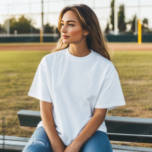 Women's white oversized t-shirt mockup. Youth girl model sitting on bench in stadium. Sports young woman, college, university student. Regular short sleeve tee. Urban, sports lifestyle casual tee