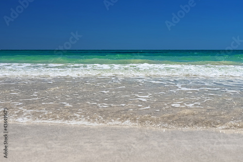 Wonderful view of the lagoon, seashore, white sand beach and blue sea. Djerba Island, Tunisia