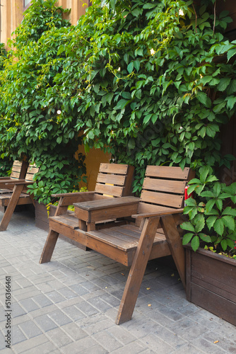 Wood bench in the bushes. Wood chairs with table in front of cafe.