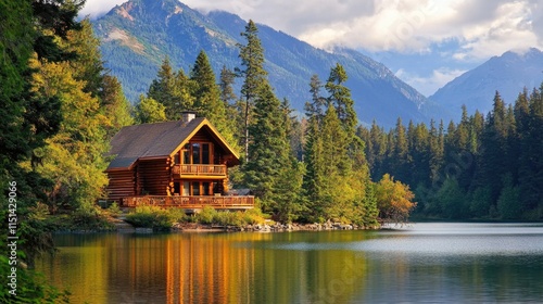 Wood cabin on the lake - log cabin surrounded by trees, mountains, and water in natural landscapes