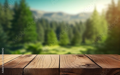 Wood planks and blurred garden background