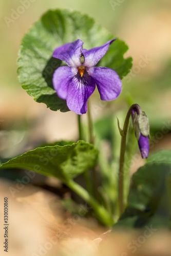 Wood violet (Viola odorata) or sweet violet, English violet, common or garden violet native to Europe, hardy herbaceous flowering perennial with scented flowers and heart shaped leaf