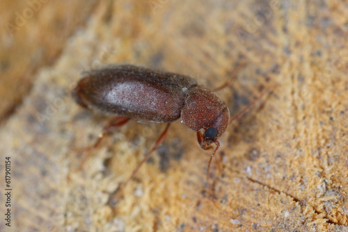 Woodboring beetle, wood borer, Anobiidae (Ernobius) on wood. High magnification.