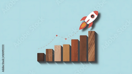 growth, rocket, business, success, upward, progress, finance, investment, startup, launch, career, development, strategy, concept, idea, achievement, goal, planning, future, opportunity, bar chart, wooden, chart, datum, economic, financial, increase, profit, revenue, skyrocket