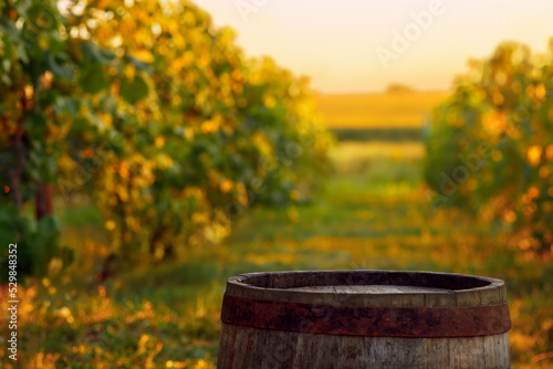 wooden barrel for wine on vineyard in countryside at sunset