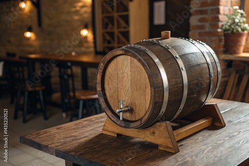 Wooden Barrel Placed on a Rustic Table in a Warm Setting Generative AI