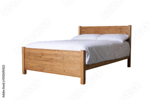 Wooden bed with white bedding, isolated on a transparent background (PNG).