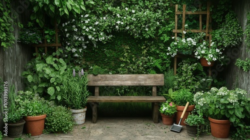 Wooden bench nestled in a blooming garden, offering a serene outdoor retreat