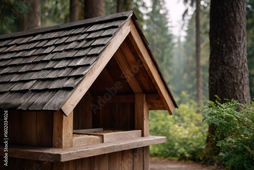 bird feeder, birdhouse, bird, seed, forest, wood, wooden, roof, shingle, nature, feeding, wild, wildlife, animal, environment, park, tree, brown, grain, feeder, house, shelter, nobody, no people, cedar, pine, fir, spruce, washington, oregon, idaho