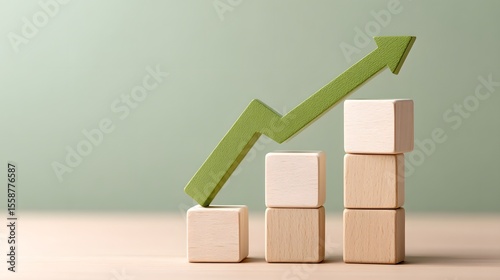 Wooden Block Bar Chart with Rising Green Arrow Symbolizing Business Growth, Strategy, and Success Concept