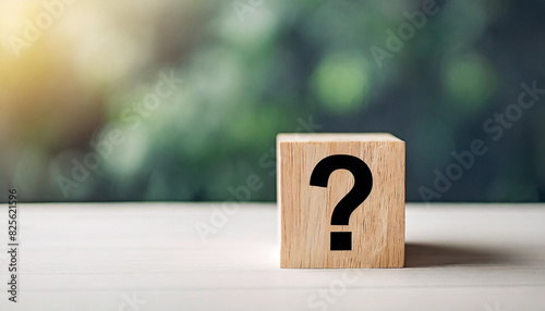 wooden block with a question mark stands on a white table, symbolizing uncertainty or inquiry. The minimalist backdrop emphasizes the concept, providing ample caption space on the right