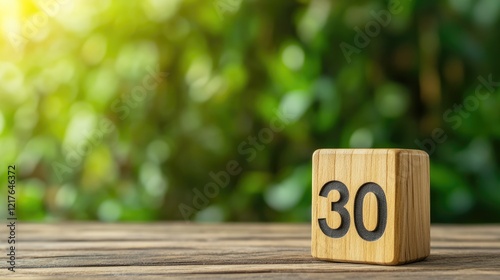 Wooden block with number 30 on rustic table with blurred green foliage background Copy Space