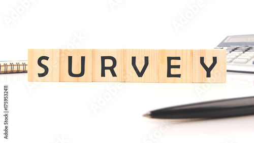 Wooden blocks neatly form the word survey, surrounded by a calculator, a pen, and a notepad in a clean office space, suggesting research or data collection activities