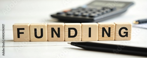 Wooden blocks spell funding. Calculator pen lie on white table. Finance theme. Budget, investment, business concept. Money, banking. Start-up ideas. Charity, donation. Financial planning, accounting,
