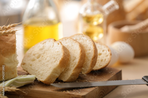 Wooden board with cut bread and knife on kitchen table