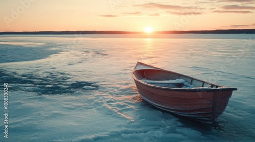 Wooden boat gently resting on a frozen lake, illuminated by the warm hues of a sunset reflecting off the icy surface.