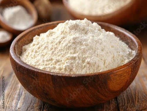 Wooden bowl filled with a mound of white flour, with additional flour in blurred background.