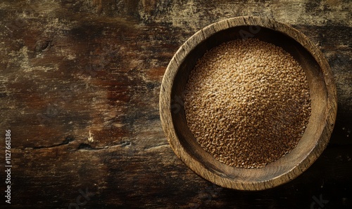 Wooden bowl of organic flaxseed or linseed on rustic table top view.