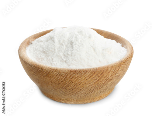 Wooden bowl with baking soda on white background