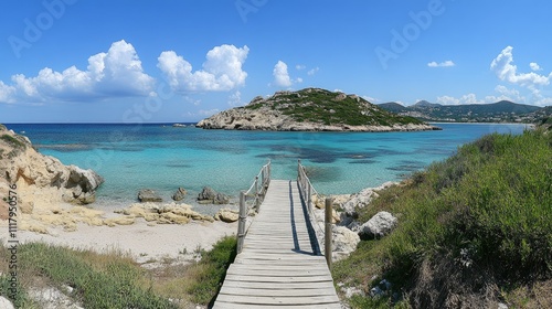 bridge, wooden, beach, cove, turquoise, water, sea, ocean, sky, blue, cloud, sun, summer, island, rock, sand, coast, shore, landscape, scenic, view, tranquil, serene, peaceful, calm, beautiful, nature, mediterranean, greek, get-away, vacation, holiday, paradise, idylli, escape, relax, unwind, journey, path, destination