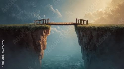bridge, gorge, cliff, wooden, connection, overpass, sky, cloud, sunlight, water, mist, nature, landscape, dramatic, serene, tranquil, horizon, gap, vale, high, edge, adventure, crossing, risk, scenic, isolation, metaphor, journey, freedom, wilderness, imagination, surreal, dreamlike, exploration, huge, mysterious, peaceful, elevation, solitude