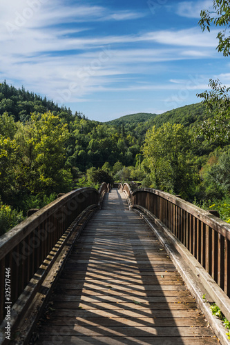Wooden bridge surrounded by vegetation and trees with clouds in the blue sky