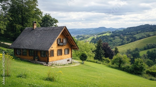Wooden Cabin on a Hillside with a Panoramic View