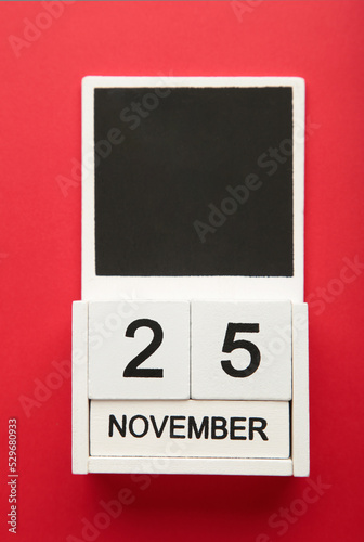 Wooden calendar 2022 with inscription 25 november on red background. Black friday. Vertical photo
