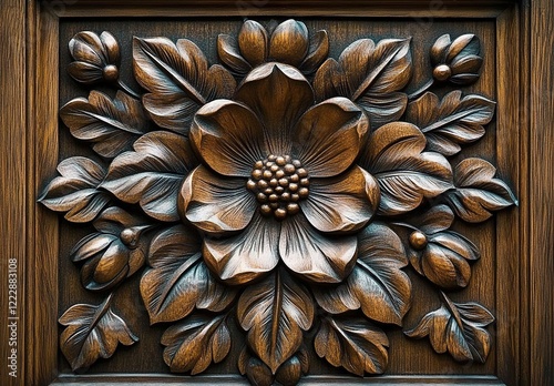 Wooden carved flower pattern on the door, with beautiful details and decorative elements.