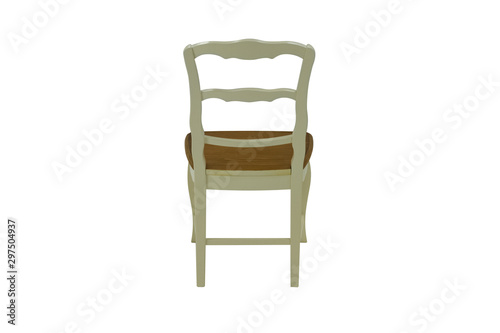 Wooden chair with a beige back with a dark seat on a white background. Back view.