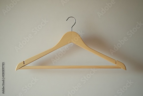 Wooden Clothes Hanger with Metal Hook Against a Textured White Wall