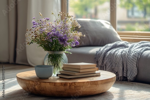 wooden, table, hot drink, flower, vase, book, mug, cup, purple, light, sun, window, room, home, interior, cosy, comfortable, relaxing, style, design, decor, aesthetic, natural, spring, summer, tranquil, peaceful, serenity, calm, soft, gentle, neutral, grey, blanket, carpet, floor, rustic, modern, simple, elegant