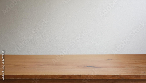 Wooden countertop with a white wall background, perfect for showcasing products.
