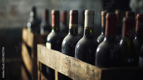 wine, wine cellar, wooden crate, wooden box, red wine, bottle, crate, rustic, luxury, vintage, aged, elegant, barrel, alcohol, drink, table, floor, wine tasting, connoisseur, wine shop, commerce, retail, cardboard box, eatery, bar, high-quality, closeup, still life, food and drink, celebration, holiday, dark, brown, wine rack, european, french