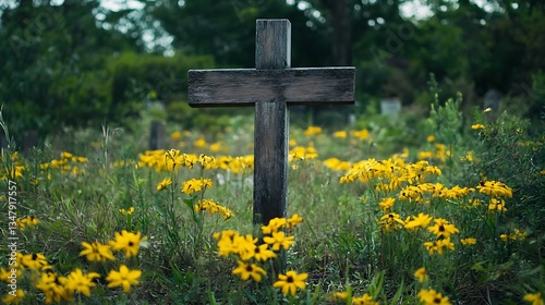 cross, cemetery, grave, flower, yellow, wooden, religious, death, memorial, remembrance, faith, spiritual, peace, calmness, nature, grass, green, summer, daytime, landscape, stillness, serenity, calm, quiet, solitude, beauty, bloom, flora, wildflower, rustic, old, weathered, burial, ground, plant, funeral