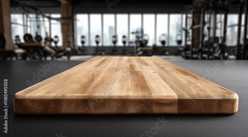 wooden, cutting, board, gym, fitness, exercise, equipment, physical exercise, health, strength, training, studio, interior, modern, design, surface, table, product, display, view, city, window, background, dark, grey, light, brown, natural, grain, texture, empty, preparation, kitchen, eatery, food, horizontal, long, rectangle, perspective, composition, sharpened, foreground, blur, industrial