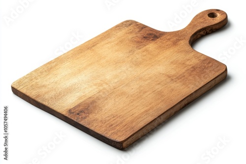Wooden Cutting Board Isolated on a White Background. Rustic wood cutting board with Handle. Banner. Cooking utensils. Empty Space for Text or Design. Mock up Banner. Podium for Montage Installation.